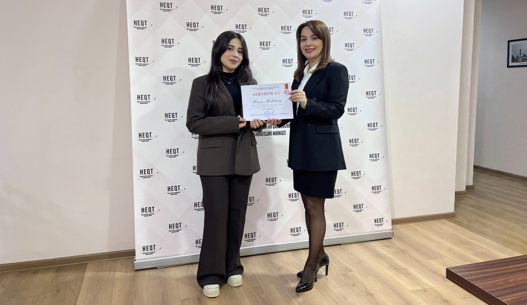 Təcrübə proqramını uğurla başa vuran təcrübəçiyə Hüquqi Ekspertiza və Qanunvericilik Təşəbbüsləri Mərkəzinin İcraçı direktorunun müavini Kamalə Paşayeva tərəfindən sertifikat təqdim olunub.